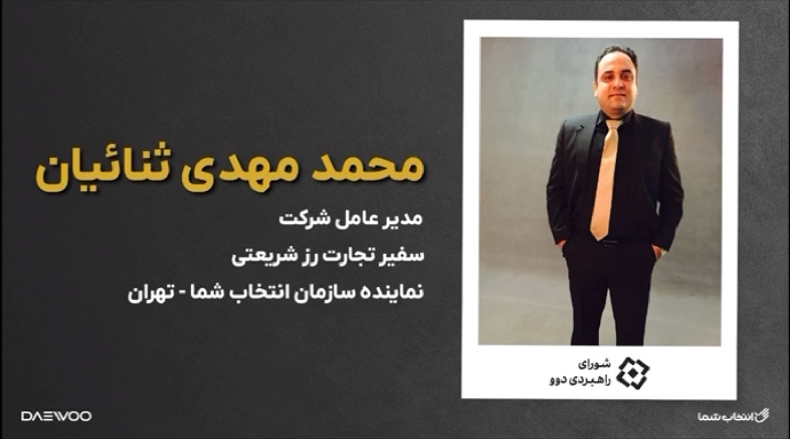 1404/10/06 آقای ثنائیان مدیر عامل شرکت رز شریعتی عضو شورای شرکت دوو و نماینده فروش تهران شدند آقای ثنائیان مدیر عامل شرکت رز شریعتی عضو شورای شرکت دوو و نماینده فروش تهران شدند